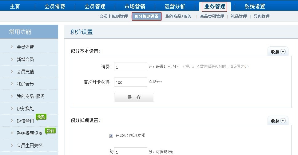 折扣率在新增儲值卡時可以進行輸入,積分在【積分規則設置】功能里面設置好,消費即可累積積分。