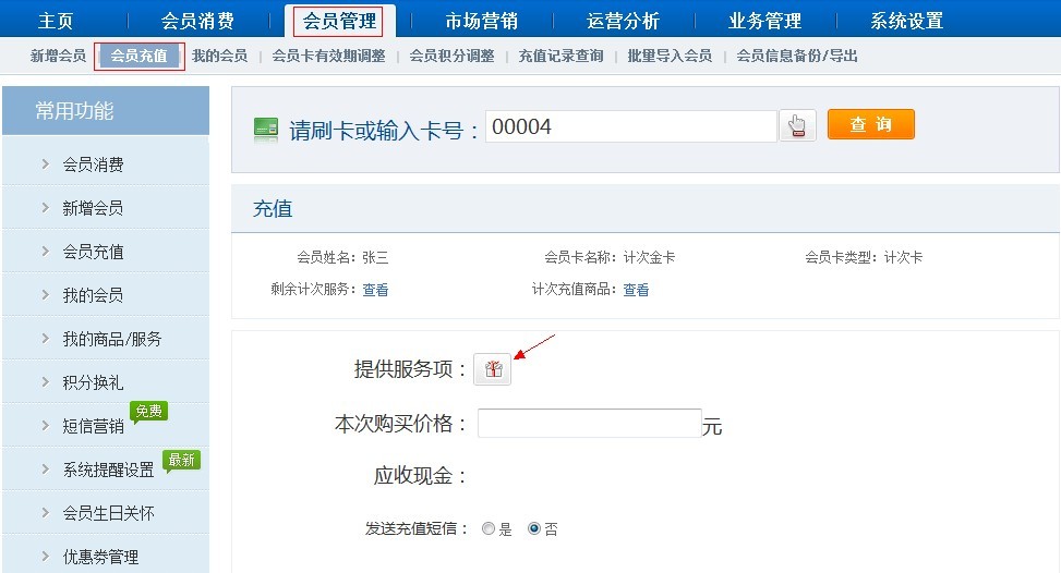 計(jì)次卡充值點(diǎn)擊-“提供服務(wù)項(xiàng)目”小圖標(biāo),選擇需要充值的服務(wù)商品,確認(rèn)充值。