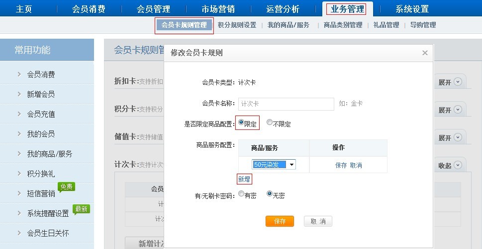 【業(yè)務(wù)管理】-【會(huì)員卡規(guī)則管理】選擇計(jì)次卡,點(diǎn)擊修改-選擇限定-新增服務(wù)商品-最后保存。
