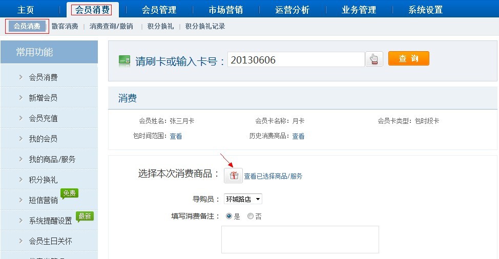 【會(huì)員消費(fèi)】功能里面包時(shí)段卡消費(fèi),點(diǎn)開(kāi)消費(fèi)商品圖標(biāo),進(jìn)行選擇對(duì)應(yīng)的服務(wù)次數(shù)完成消費(fèi)。