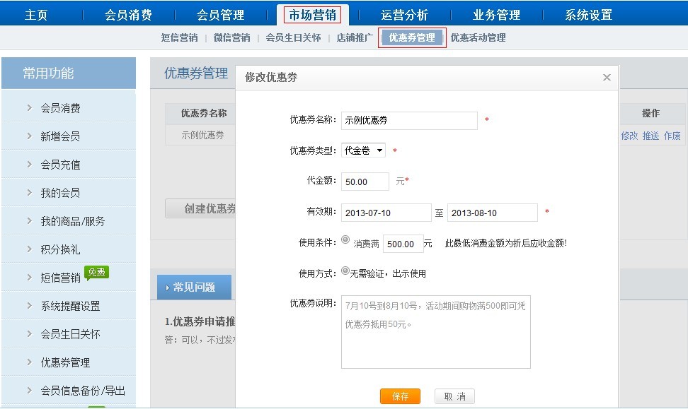 商卡通會員管理系統優惠劵管理功能。【市場營銷】-【優惠劵管理】界面截圖: