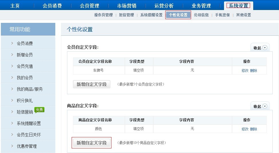 會員卡管理缺少不了商品管理,商品管理中的新增商品自定義字段,達到商品屬性自定義的效果。