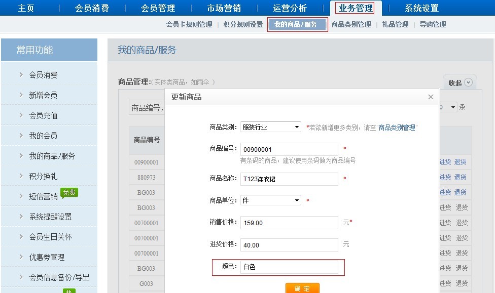 完成新增自定義字段后,登陸商卡通會員管理軟件【業務管理】-【我的商品/服務】-【上架新商品】功能,即會顯示出自定義字段“顏色”填空項。